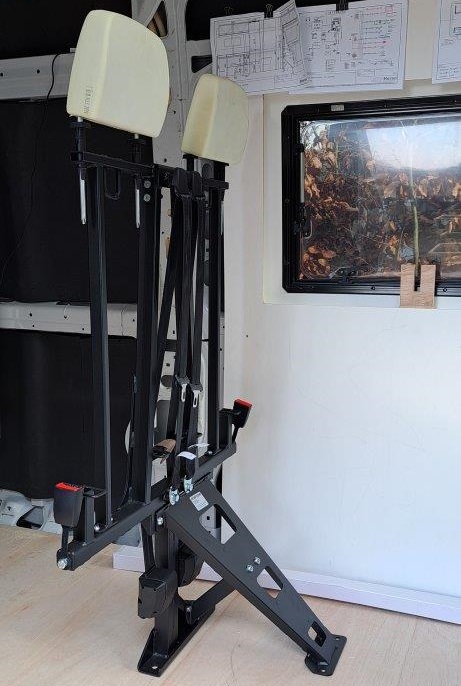 Hieronder vind je een technische omschrijving van een camperombouw waarin van een standaardopstelling met stoel en bank wordt overgegaan naar twee individuele zitplaatsen voorin en een gordelbok met goedgekeurde driepuntsgordels achterin.